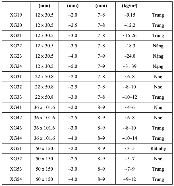 Để hiểu chính xác lưới mắt cáo giá bao nhiêu, bạn cần tìm hiểu bảng thông số kỹ thuật chi tiết dưới đây. Bởi mỗi mã lưới sẽ có kích thước, độ dày và trọng lượng khác nhau, từ đó quyết định trực tiếp đến giá thành sản phẩm.